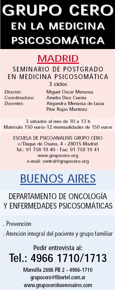 A.M.: Queremos agradecer la posibilidad de realizar este acto al Ilustre Colegio Oficial de Médicos, que nos ha cedido amablemente la sala, especialmente a su presidenta, la Dra. Fariña. P.R.: A la Escuela de Psicoanálisis Grupo Cero, en la que nos formamos como psicoanalistas, especialmente al Director de la Escuela, el Dr. Miguel Oscar Menassa, también Director del Seminario de Medicina Psicosomática, desde donde se lleva a cabo toda la investigación que ha tenido como fruto este libro, que inaugura una serie, y a la Dra. Amelia Díez, coordinadora del mismo seminario y de inestimable ayuda en la corrección del texto. A los compañeros, entre ellos muchos médicos, del seminario, porque también han contribuido a su producción. A las Facultades de Medicina de la Universidad Autónoma de Madrid y de Alcalá de Henares, donde nos formamos como médicos, y al Hospital Doce de Octubre, donde nos especializamos.