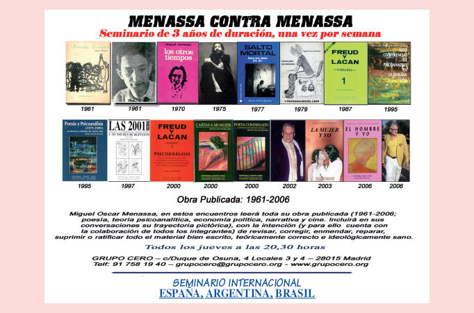 OSCAR MENASSA Segunda Conferencia (3 de abril de 1995) (.../...) El problema de las ciencias es nacer mutiladas, nada de averiguar todo el inconsciente que anda por el mundo. No, hay un inconsciente que nos interesa, que vamos a determinar, que vamos a estudiar. El inconsciente sexual, entendiendo por sexual que somos seres hablantes, inconsciente reprimido, ése es el inconsciente que nos interesa. ¿Qué otro inconsciente hay? Yo expliqué que hay otro inconsciente. en toda práctica esotérica hay inconsciente y ése el psicoanálisis no lo estudia. En las experiencias parapsicológicas que se hicieron de comunicación mental, en la zona muda del pacífico, donde ningún elemento electromagnético funcionaba, sí lo hacía la transmisión parapsicológica, entonces ahí evidentemente tiene que funcionar el inconsciente, en tanto escapa al control de la razón lo que ocurre. Yo no sé si se llegó a realizar, pero se había propuesto para transmitir mensajes a los satélites tripulados. Ahí hay un inconsciente, pero no lo tenemos estudiado, no está dentro de lo conceptualizado. A toda ciencia hay algo que se le escapa, ninguna puede ser una visión de la realidad, la famosa “Weltanschauung” de los alemanes, cuando es una visión del mundo no es más una ciencia, es una ideología, es una filosofía. A una ciencia le está impedido ser una visión del mundo, porque es absoluta, pero sólo sobre aquello que determina. Por ejemplo, el psicoanálisis podría meterse en la vida del paciente para que el paciente hiciera o no hiciera tal cosa en la realidad, eso es absolutamente imposible. El psicoanalista no puede meterse en la vida de nadie, primero de todo le está vedado por la propia teoría, pero además si lo intentara nada conseguiría. El poder de la transferencia, esa relación tan peculiar que se organiza entre el paciente y el terapeuta, es un poder si no se utiliza; en cuanto el terapeuta quiere utilizarlo por su inexperiencia o por su tontería, se rompe, se desarticula, no hay más transferencia, por lo tanto se acabó el tratamiento. El paciente se va, ya no escucha. En todo caso, el psicoanálisis podría servir para levantar las inhibiciones que me impiden hacer eso que quiero hacer. Y aquí es donde nosotros trabajamos todo el problema de la creación. A veces la gente nos pregunta, pero ¿ustedes en la Escuela de Poesía le enseñan a escribir a la gente? No, pero la gente puede aprender a escribir sin que nadie la enseñe. Uno no les enseña a escribir, uno les enseña a levantar las inhibiciones y los prejuicios que se tienen frente a la escritura. Así, el sujeto puede aprender a escribir, que por otra parte es un don humano, que todos deberíamos poder hacerlo, si no, se trata de una inhibición.